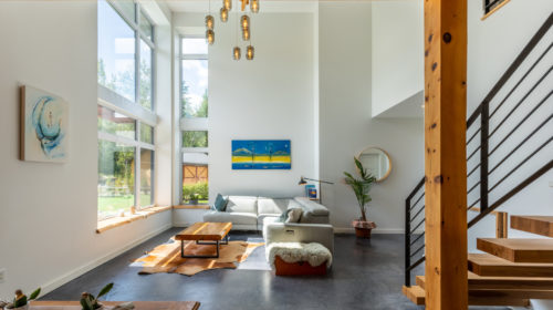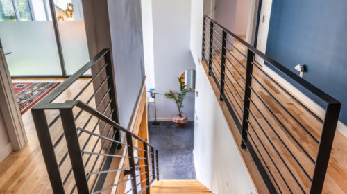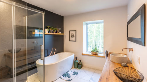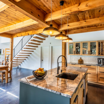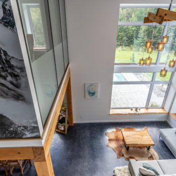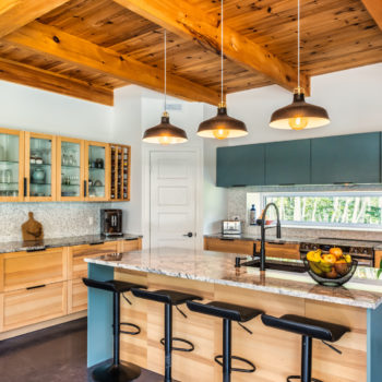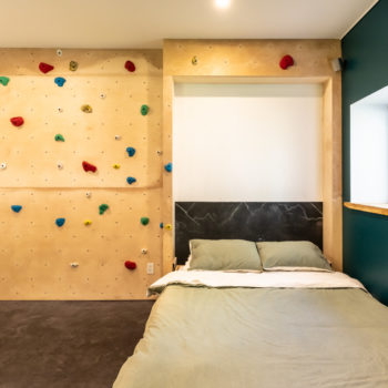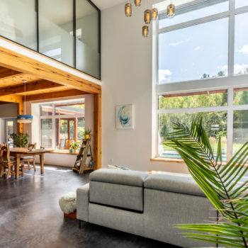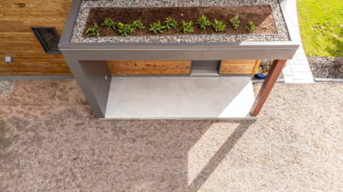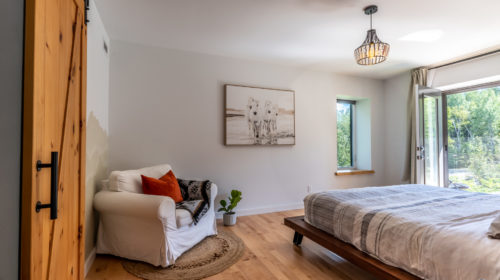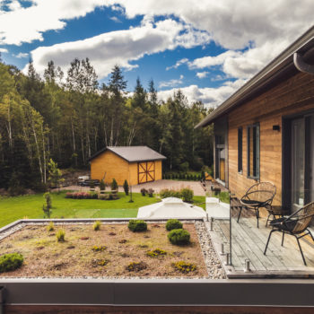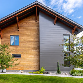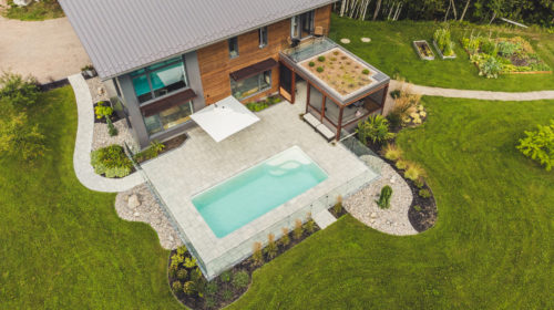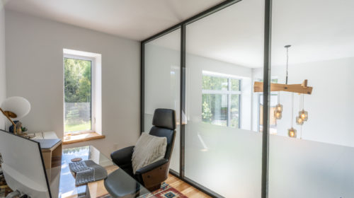 Terminée en 2020, la maison Horizon est la construction la plus performante que Solutions Résidentielles ait réalisé jusqu’à maintenant. Certifié LEED Platine, la construction a été réfléchie sur mesure pour bénéficier de l’énergie solaire passive et répondre parfaitement aux besoins et au mode de vie de ses occupants. Pour ce faire, dans l’aménagement des espaces, une salle pour ranger le matériel de plein air communique avec le vestibule d’entrée. Une pièce multifonctionnelle au rez-de-chaussée joue le rôle de salle d’escalade, de salle d’entraînement et de yoga, de coin cinéma et de chambre d’invités. À l’extérieur, on retrouve une place couverte qui devient une extension de la cuisine l’été. Le toit vert de cette dernière donne sur la chambre principale à l’étage. Toutes les plantes extérieures sont vivaces. En plus du jardin, les plates-bandes adjacentes à la cuisine regorgent de fines herbes et de fleurs comestibles. Comme alternative au gazon, le terrain a été recouvert de trèfle qui fleuri pour le grand bonheur des polinisateurs.
