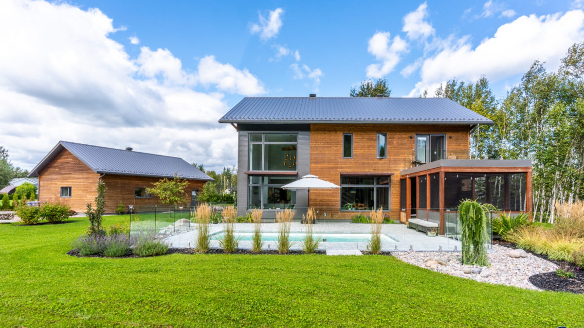 Terminée en 2020, la maison Horizon est la construction la plus performante que Solutions Résidentielles ait réalisé jusqu’à maintenant. Certifié LEED Platine, la construction a été réfléchie sur mesure pour bénéficier de l’énergie solaire passive et répondre parfaitement aux besoins et au mode de vie de ses occupants. Pour ce faire, dans l’aménagement des espaces, une salle pour ranger le matériel de plein air communique avec le vestibule d’entrée. Une pièce multifonctionnelle au rez-de-chaussée joue le rôle de salle d’escalade, de salle d’entraînement et de yoga, de coin cinéma et de chambre d’invités. À l’extérieur, on retrouve une place couverte qui devient une extension de la cuisine l’été. Le toit vert de cette dernière donne sur la chambre principale à l’étage. Toutes les plantes extérieures sont vivaces. En plus du jardin, les plates-bandes adjacentes à la cuisine regorgent de fines herbes et de fleurs comestibles. Comme alternative au gazon, le terrain a été recouvert de trèfle qui fleuri pour le grand bonheur des polinisateurs.