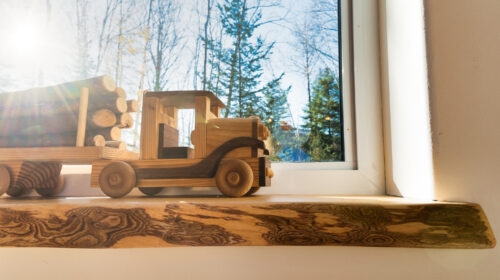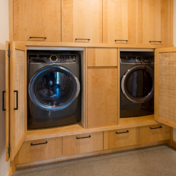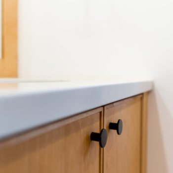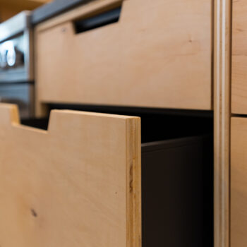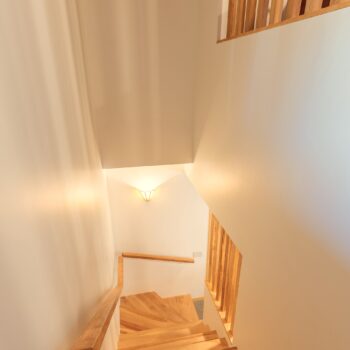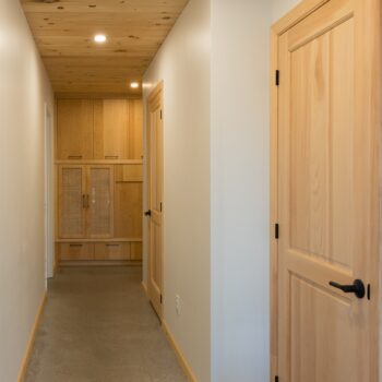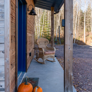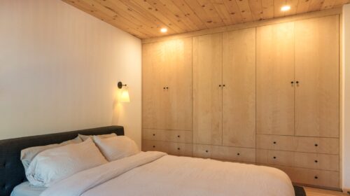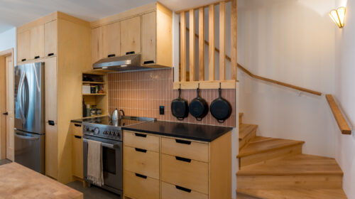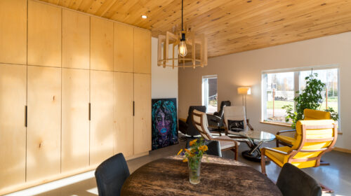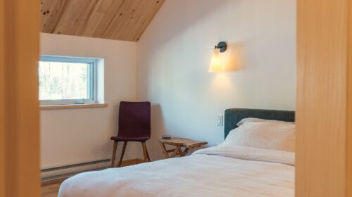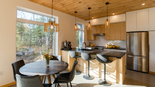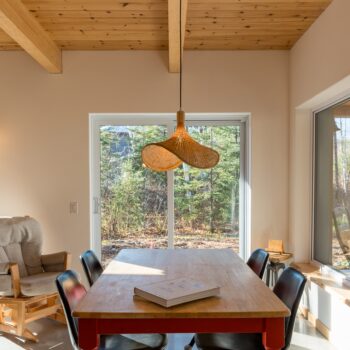 La maison est séparée en deux parties par une entrée commune dans laquelle se trouve de grands rangements ainsi qu’une laveuse et une sécheuse utilisées par les deux familles. Les grands-parents habitent un plain-pied alors que leurs enfants et leurs petits-enfants occupent la partie de la maison à deux étages. Le bois est omniprésent à l’intérieur rendant les lieux chaleureux et enveloppants. Tous les matériaux intérieurs ont été choisis pour éviter au maximum les émanations de COV, préservant ainsi la qualité de l’air et la santé des occupants. Le cèdre naturel comme revêtement extérieur ne nécessite que très peu d’entretien. La couleur du cèdre évolue selon son exposition au soleil et aux intempéries. Cette particularité confère au bâtiment un côté rustique et qui s’intègre à merveille dans la forêt de bouleaux.
