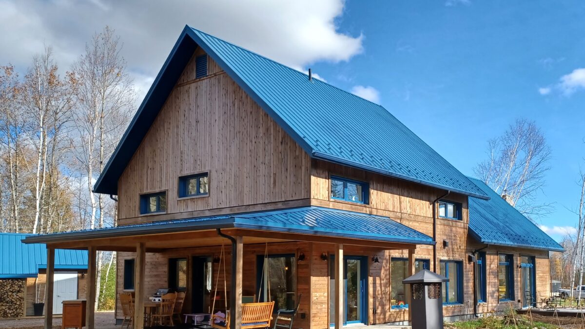 La maison est séparée en deux parties par une entrée commune dans laquelle se trouve de grands rangements ainsi qu’une laveuse et une sécheuse utilisées par les deux familles. Les grands-parents habitent un plain-pied alors que leurs enfants et leurs petits-enfants occupent la partie de la maison à deux étages. Le bois est omniprésent à l’intérieur rendant les lieux chaleureux et enveloppants. Tous les matériaux intérieurs ont été choisis pour éviter au maximum les émanations de COV, préservant ainsi la qualité de l’air et la santé des occupants. Le cèdre naturel comme revêtement extérieur ne nécessite que très peu d’entretien. La couleur du cèdre évolue selon son exposition au soleil et aux intempéries. Cette particularité confère au bâtiment un côté rustique et qui s’intègre à merveille dans la forêt de bouleaux.